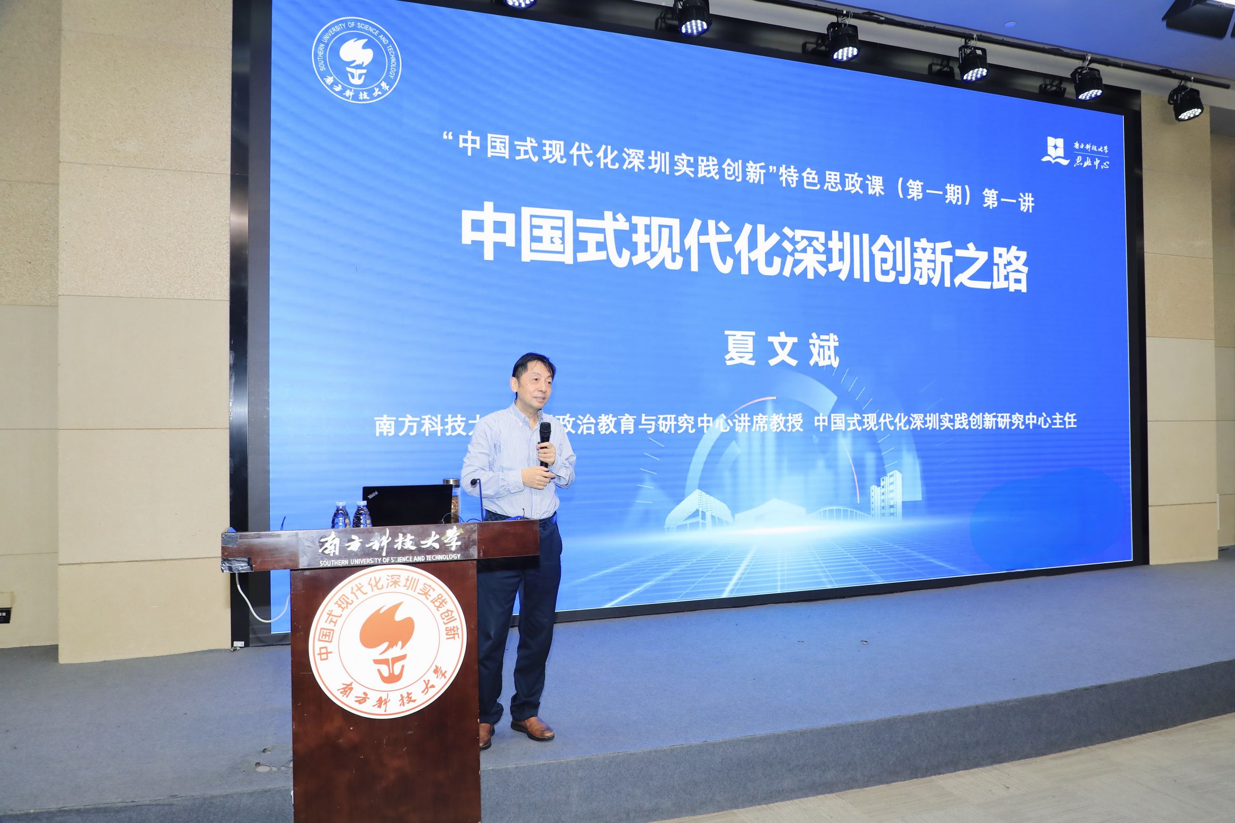 2025年3月13日下午,南方科技大学“中国式现代化深圳实践创新”特色思政课首期课程在第一科研楼报告厅举行。我校思想政治教育与研究中心讲席教授、中国式现代化深圳实践创新研究中心主任夏文斌以“中国式现代化深圳创新之路”为题,聚焦改革开放历程、高质量发展路径以及未来使命,深入解析深圳的创新密码。全体思政课教师以及200余名学生代表现场聆听报告,思想政治教育与研究中心主任王德军教授主持活动。